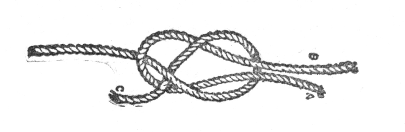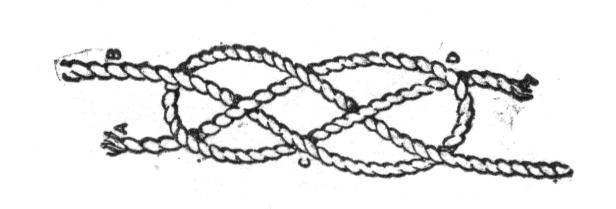 Turn the end of one rope A over its standing part B to form a loop. Pass the end of the other rope across the bight thus formed, back of the standing part B over the end A, then under the bight at C, passing it over its own standing part and under the bight again at D.