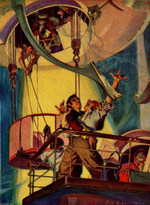 The bridge (let us ever bless the G. P. O. as a repository of ancientest tradition!) is represented by a view of Captain Hodgson's legs where he stands on the control platform that runs thwartships overhead. The bow colloid is unshuttered and Captain Purnall, one hand on the wheel, is feeling for a fair slant. The dial shows 4,300 feet.