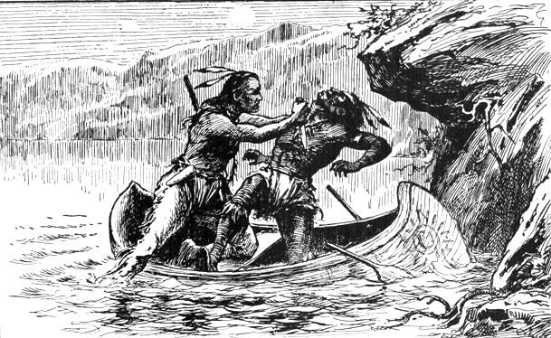 It is hardly to be supposed that he intended this outcry as a hail to the boat, which he must have seen contained no one. Its appearance would naturally suggest to one in his situation that the occupant had been alarmed by the signs of danger and had taken to the land. This supposition was so natural that Hardynge would probably have got safely by the dangerous point but for a totally unlooked-for mishap. The water, which up to this time had been fully six feet in depth, suddenly shallowed to less than a quarter of that, so that he struck his knees against the bottom. The shock was very slight, and scarcely caused a ripple; but it takes only the slightest noise to alarm an Indian, especially when he is on the watch. That faint plash caused by the jar of the body caught the ear of the listening, peering redskin, who instantly slid his body over the bluff, and balancing himself for an instant, dropped with such precision that he struck the canoe in the very center, and preserved its gravity so well that it tipped neither to the right nor left.