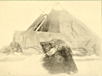 Having drunk the tea, we rolled up in our fur robes, lying side by side around the tepee, with feet toward the fire and head against the sledge, knees into the back of the man next you, and snow-shoes under your head, away from the dogs that would eat the lacing. This was only preparation for sleep; actual sleep, even to men as tired as we were, never came until the dogs had finished fighting over us; for so soon as we were rolled in our robes the dogs invariably poured into the tepee. As there were twenty-eight dogs, and the lodge about seven feet in diameter at its base, I need not further describe the situation. Truth is, that no hour in the day or night was more miserable than this, when these half-starved brutes fought over and on top of us before they finally settled down upon us. In extreme cold weather a dog curled up at your feet or at your back is not unpleasant; but to have one lying on your head, another on your shoulders or hips, or perhaps a third on your feet, and you lying on your side on rocky, uneven ground—take my word for it, the experience is not happy. Of course you are entirely wrapped up, head and arms as well, in your sleeping robe; if you rise up to knock the dogs off, you open your robe to the cold: and the dogs would be back on top of you again just as soon as you had lain down.