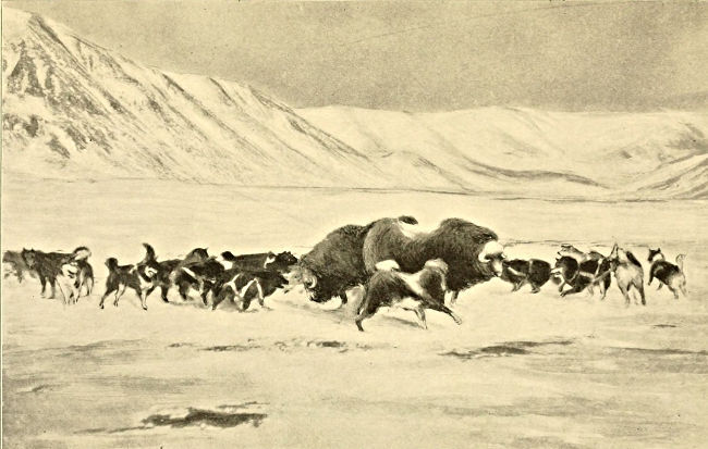 Hunting musk-oxen on the Arctic Coast or the Arctic islands after the manner of the polar expeditions, is a much simpler proposition. There the hunters are always comparatively near their base of supplies, and, from all accounts, the musk-oxen are more numerous than they are in the interior. According to Frederick Schwatka, the Innuits hunt musk-oxen with great skill. They hitch their dogs to the sledge differently from the method of the Indians to the south. The southern Indians hitch their four dogs in tandem between two common traces, one on each side; while each Eskimo dog has his own single trace, which is hitched independently to the sledge. When the Innuits sight the musk-oxen, each hunter takes the dogs of his sledge, and holding their traces in his hand, starts after the game. The wisdom of this method is twofold: in the first place it immeasurably aids the running hunter, for the four or five straining dogs practically pull him along; indeed, Schwatka says that when these Innuits come to a hill they squat and slide down, throwing themselves at full length upon the snow of the ascending bank, up which the excited dogs drag them without any effort on the part of the hunter. I should like to add here that if such a plan were pursued in the Barren Grounds over the rocky ridges, the remains of the hunter would not be interested in musk-ox hunting by the time the top of a ridge was reached. Seriously, the chief value of hunting in this style is that the hunter controls his four to six dogs, the usual number of the Eskimo sledge. When they have caught up with the musk-ox herd, he then looses them and he is there to begin action. The Eskimo dogs are very superior in breed to those used by the Indians farther south, and are trained as well to run mute.