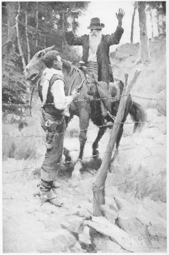 The cabin on Spit-Cat Creek lies lonely among the high pastures, and looks down to further loneliness across many slanting levels of pine-tops. These descend successively in smooth, odorous, evergreen miles until they reach the open valley. Here runs the stage road, if you can discern it, from the railway to the continuously jubilant cow-town of Likely, Wyoming; and here, when viewed from the cabin through a field-glass, you can readily distinguish an antelope from a stone in the clear atmosphere which commonly prevails. The windows of the cabin are three, and looking in through any of them you can see the stove, the table, and the ingenuous structure which does duty as a bed. During the season of snow, from November until May, the cabin (in the days of which I speak) was dwelt in by no one; while through the open weather some person of honesty and resource would be sent thither from the headquarters ranch on Sunk Creek two or three times, to stay no longer than his duties required, and to come back with his report as soon as they should be performed. Such a man would live here with canned food and the small stove, seldom having other company than his own, and, if he had ears for the music of nature, the singing pines would often companion him, he could hear now and again some unseen bird crying as it passed among them, and always the voice of Spit-Cat. This stream foamed by the cabin to fall and wander deviously away into the great, distant silence of the mountains. Likely was eighteen miles distant, and to this place the man could ride in four hours by a recently discovered trail, which was the shorter one, and followed the smaller tributary stream of Spit-Kitten; and sometimes the man did so ride for his mail, or for more canned food, or for a game of chance and female company, in the continuously jubilant cow-town of Likely, Wyoming.