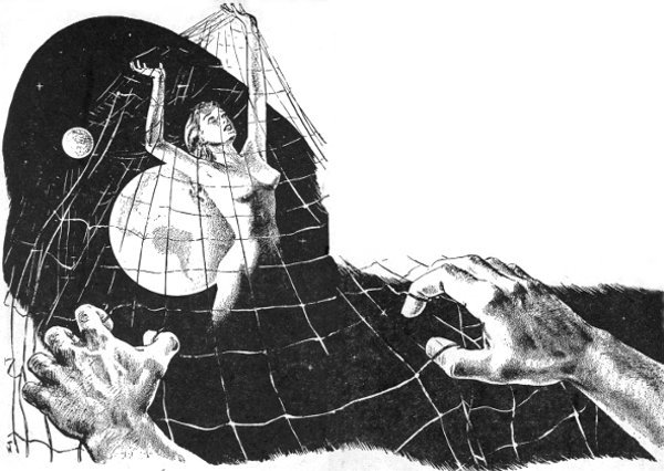 Earth grew in the viewplate; expanding majestically to obliterate the surrounding space, it grew shimmery along its almost regular circumference. The orbit of his saucer-shaped ship flattened into a great spiral. The ship twisted around the Earth from shadow to light and then into shadow again as if it were attached to the loose end of a piece of string being wound up by the slowly turning planet. Gravity pressed his body, crushed him; a sudden, sickening drop left him weightless.